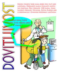 Dobar golman Poslije utakmice navijač razgovara s golmanom: - Sjajno si igrao. - Ali branio sam jako loše! Čak sam dva gola primio. - Ne smeta, ja navijam za protivničku momčad. U školu radosno Pita tata sina: - Voliš li ti ići u školu? - Kako da ne, odgovori sin – i u školu i iz škole, također. Samo ne volim ono između. Stonogica Mala stonoga žali se mami: - Boli me noga. - Zlato mamino, a koja te noga boli? - Ne znam mama, ja znam brojiti samo do 10. Kabelski telefon Uveli Štefu telefon u kuću i sutradan on zove poštu: - Halo, pošta, jeste li to vi? - Da, izvolite. - Biste li mogli povući žicu sa svoje strane? Znate, kod mene u stanu je ostao duži kraj pa se stalno zaplićem! Nove cipele Mama pita sina: - Zašto ne obučeš svoje nove cipele? Sin joj odgovori: - Sjećaš se da je teta u trgovini rekla da me prvih nekoliko dana cipele mogu žuljati pa ću ih obući tek sljedećeg tjedna. Crvenkapica danas Ide Crvenkapica kroz šumu i susretne vuka: - Kamo ideš, Crvenkapice? - Baki. - A hoćeš li mi dati njezinu adresu? - Kako da ne, baka@baka.com. Stiže autobus Idu dvije čačkalice, kada pokraj njih prođe jež. Jedna od njih veli drugoj: - E mogle smo i mi uzeti autobus. Prvi put u operi Jurica je prvi put u operi. Znatiželjno promatra i pita: - Tko je onaj što nam okreće leđa? - To je dirigent. - A zašto štapom prijeti onoj teti? - Ma, ne prijeti joj. - A zašto onda ona vrišti? |