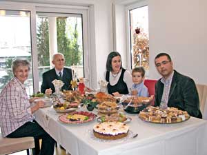 Blagdan Božića se slavi jedan dan, 25. prosinca, ali je njegovo blagovanje prošireno na nekoliko dana – prije i poslije. Liturgijski, naravno, on je produžen kroz Božićnu osminu (osam dana) i svoj završetak ima tek sa Svetkovinom Bogojavljenja (Sveta tri kralja), ili još duže sa blagdanom Krštenja Gospodinova, u drugu nedjelju po Božiću. Ako je nešto blagdan u godišnjem protoku vremena, onda je to upravo Božić. Blagdan za vjernike, ali i blagdan za obitelji, prijatelje, susjede. Za svaku od ovih prigoda, kada se ljudi susreću, treba tih dana imati nešto da se stavi na stol. I oni najsiromašniji tih dana učine da im stol bude što je moguće više bogat i svečan. Božić u obitelji Aljinović Bojan, Martina i mali Jakov, te Marija (u maminom trbuhu) ovaj Božić dočekuju u zajedništvu sa Martininim roditeljima Antom i Marijom Pištelek. Obitelj je velika, kako sa strane Aljinović, tako i Pištelek. Dvije tradicije, sastale su se u Zagrebu i od božićnog menija učinile jedan tipični hrvatski božićni ručak. Pripreme su duge i ne baš lake, ali se u Hrvata božićni ručak još danas priprema doma. Za ovu prigodu će navratiti i drugi roditelji, braća i sestre, brojni prijatelji, kolege. Za sve njih će biti mjesta, feta sira i pršuta, fino pripremljeni kolač, šalica kave ili čaja i čašica razgovora. Božić kroz majčine oči Svake godine pokušavam uhvatiti svu dubinu i širinu Božića i vremena pripreme. Očekujem da ću nakon blagdana biti neka vidljivo bolja osoba. Svakako želim izbjeći da mi dijete doživi Božić kao dan kada samo fino jedemo, divimo se božićnom drvcu i otvaramo darove ali to nije u potpunosti moguće. Možda zato jer je i to dio božićnog veselja. Jakova pripremamo čitajući mu božićne priče i razgovaramo kako ćemo kititi bor i staviti jaslice, tko to leži u jaslicama i tko su Marija i Josip. Na božićno jutro idemo na misu. U crkvi je sve okićeno i Jakov uzbuđeno obilazi oko bora spremajući se skinuti kakav ukras, a mi nastojimo pratiti i misu i Jakova. Nakon mise srce mi je puno radosti i zahvalnosti što je naša mala obitelj zajedno. Božićni ručak započinje molitvom zahvale koju predvodi baka. Tada započinje prava simfonija božićnih jela. Tata, djed i Jakov nestrpljivo čekaju dok baka i ja slažemo bogatu trpezu od juhe, purice s mlincima, sarmi i mnogih priloga te domaćeg vina koje je napravio Jakovljev djed. Poslije ručka dolaze naša braća sa svojim obiteljima na kavu, tortu i kolače. Žamor odraslih i cika djece ispunja cijelu kuću dok nam se sjajna lica rumene od topline. Uzimam minutu tišine za misao i promatram svoje najdraže. Mislim kako će Jakov doživjeti Božić kao dan kada dolazi cijela obitelj, kada su svi radosni i kada mu mali Isus ostavlja šareni smotuljak ispod bora jer je bio dobar. Zadovoljna sam. Nisam uspjela uhvatiti svu dubinu i širinu Božića ali nije niti važno jer usprkos mojim naporima Božić me mijenja baš onako kako On to želi.  Predjelo Početak i kraj jela je uvijek najšareniji. I ovdje dolazi do izražaja spretnost i umijeće pripreme pršuta, kobasica, kulena...  Juha Fina i krepka. Topla i ukusna.  Sarma