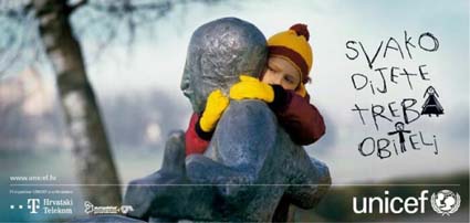 "SVAKO DIJETE TREBA OBITELJ" UNICEF-ova akcija UNICEF-ov ured za Hrvatsku, u suradnji s Ministarstvom zdravstva i socijalne skrbi te Ministarstvom obitelji, uz nositelje akcije Hrvatsku radio televiziju, Europapress holding i T-Hrvatski Telekom, pokrenuo je u veljači program za promicanje i unaprjeđivanje obiteljskih oblika skrbi o djeci bez obitelji. Konferencija za medije, održana 4. veljače, označila je službeni početak programa za promicanje i unapređivanje obiteljskih oblika skrbi o djeci bez adekvatnog roditeljskog staranja, pod nazivom "Svako dijete treba obitelj". O potankostima i ciljevima akcije javnost su tom prilikom izvijestili predstavnici nositelja i pokrovitelja spomenutog projekta.