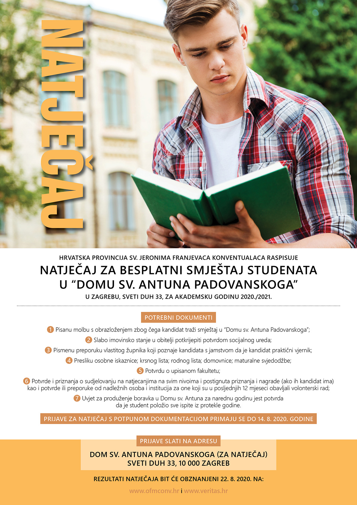Hrvatska provincija sv. Jeronima franjevaca konventualaca raspisuje Natječaj za besplatni smještaj studenata u „Domu sv. Antuna Padovanskoga“ u Zagrebu, Sveti Duh 33, za akademsku godinu 2020./2021.