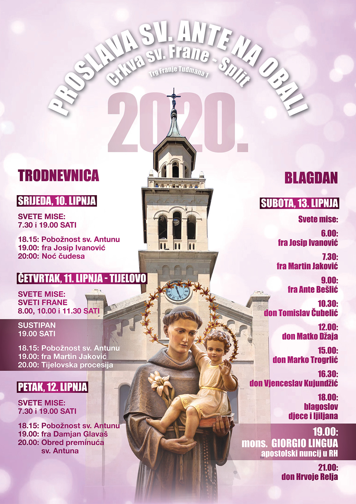 Svečevu blagdanu prethodi trodnevnica od 10. do 12. lipnja; svete mise u trodnevnici su u 7.30 i 19.00 sati, a pobožnost sv. Anti započinje u 18.15 sati. Prvoga dana trodnevnice svetu misu u 19.00 sati predslavi fra Josip Ivanović, a u 20.00 sati slijedi „Noć čudesa“ – molitveno bdjenje. Drugoga dana trodnevnice je svetkovina Tijelova; toga dana svete mise u svetom Frani su u 08.00, 10.00 i 11.30 sati, a večernja sveta misa u 19.00 sati slavit će se na Sustipanu. Poslije mise slijedi Tijelovska procesija. Treći dan svetu misu predslavi fra Damjan Glavaš, a slijedi „Obred preminuća sv. Ante“.